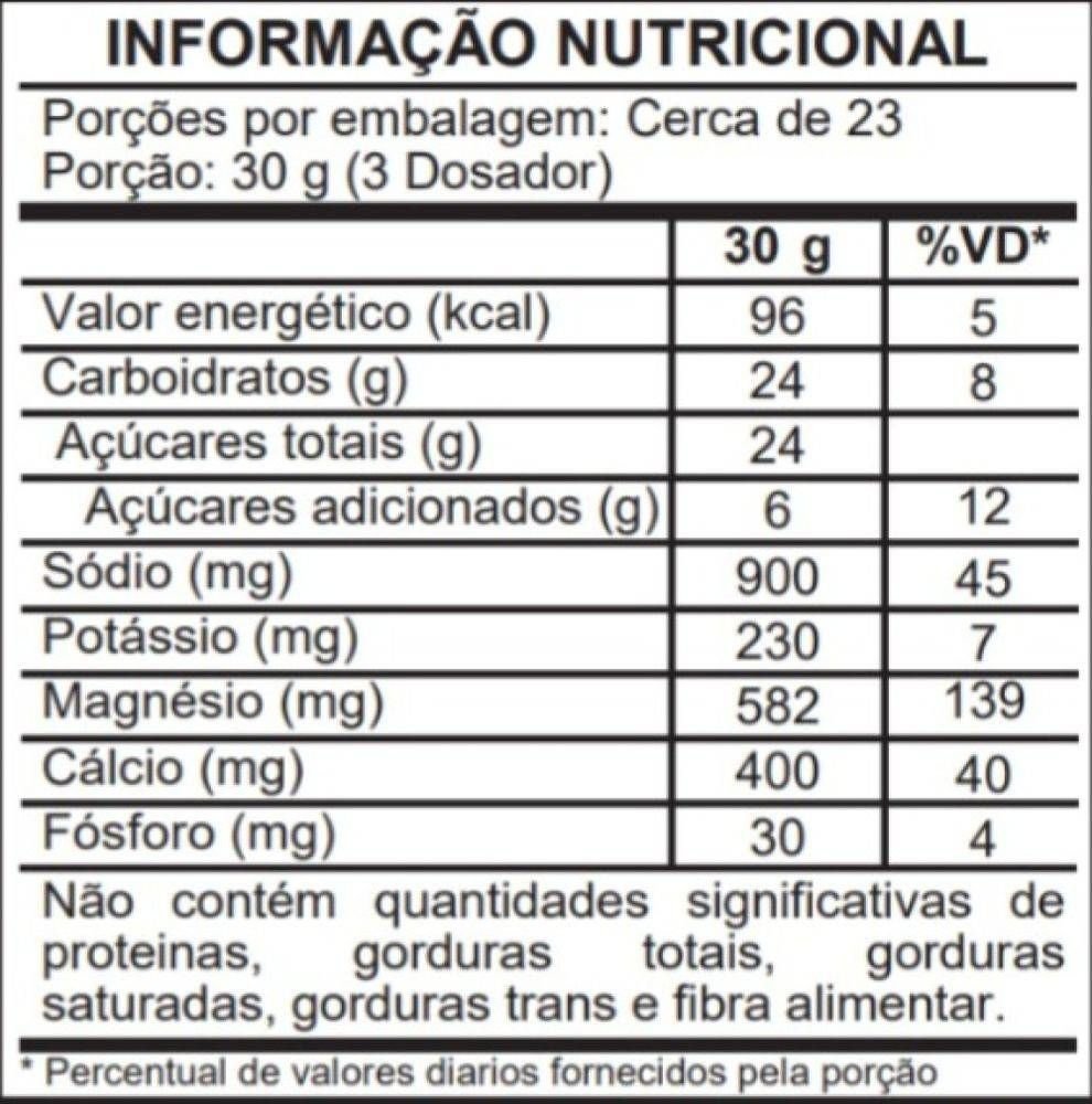 Neutro: Maltodextrina, sacarose, ácido cítrico, fosfato tricálcio, cloreto potássio, citrato de sódio, óxido magnésio, sucralose, cloreto magnésio, benzoato sódio e sorbato potássio.